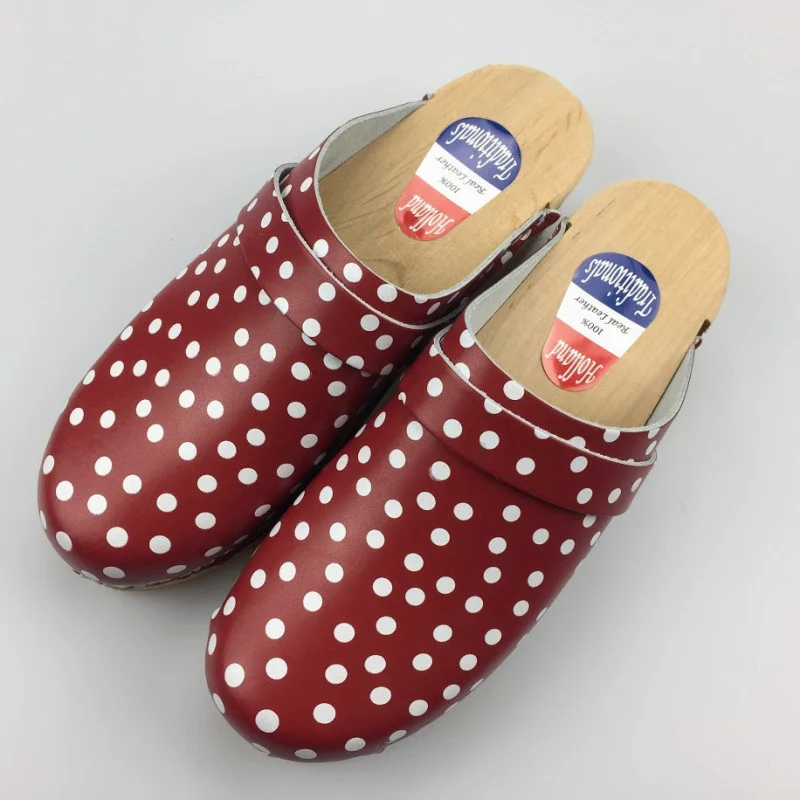 Hippe lederen damesklompen | open hiel rood-wit stip