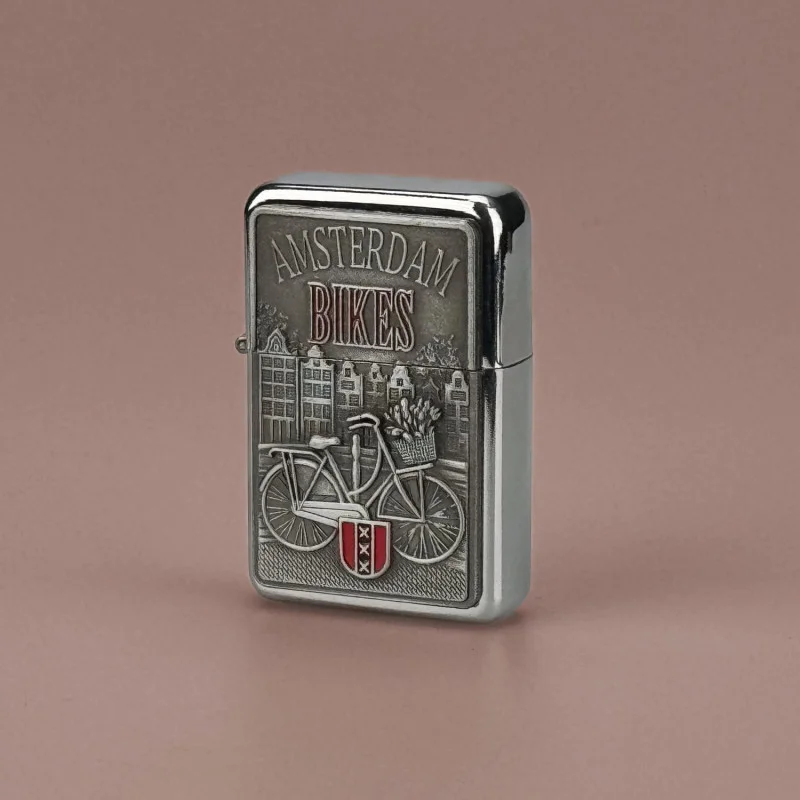 Deze hervulbare aansteker van metaal is een leuk en praktisch souvenir uit Amsterdam. De aansteker is versierd met afbeeldingen van fietsen, een typisch Amsterdams symbool. Met een formaat van 58 mm x 38 mm x 15 mm is de aansteker compact en handig in gebruik. De aansteker is hervulbaar met aanstekerolie of lampolie, waardoor hij lang meegaat. (moet nog gevuld worden)