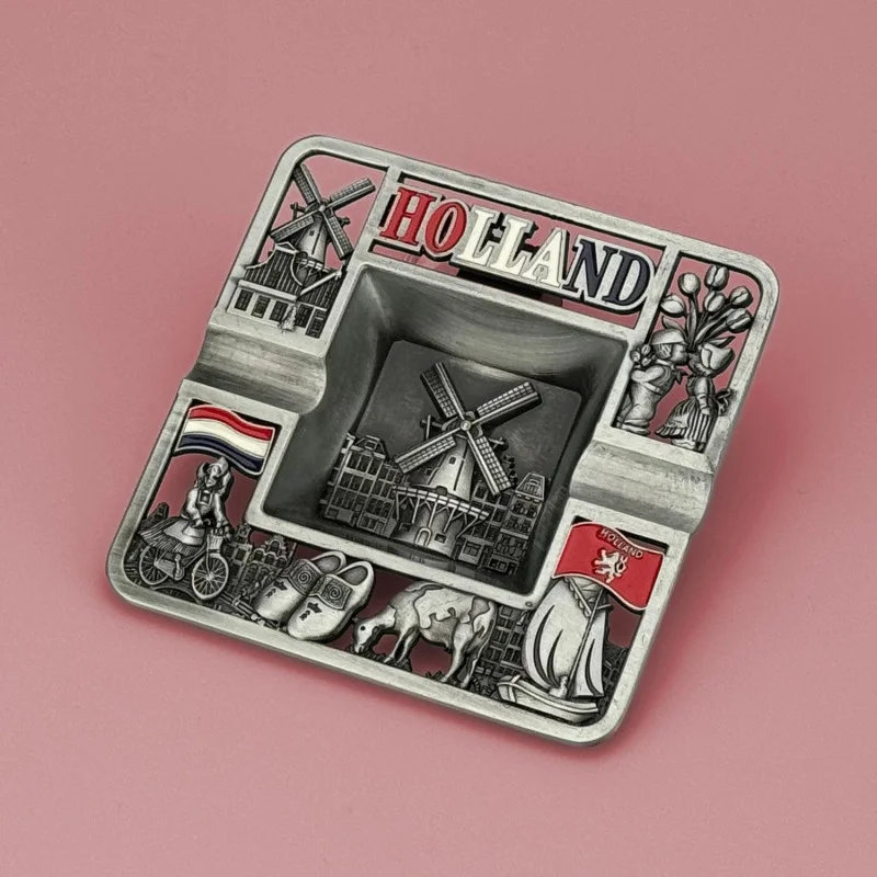 Deze vierkante asbak van tin is een leuk en praktisch souvenir uit Holland. De asbak is versierd met afbeeldingen van molens, een typisch Nederlands symbool. Met een afmeting van 105 x 105 x 20 mm is de asbak compact en handig in gebruik. De tinnen kleur geeft de asbak een klassieke en tijdloze uitstraling.