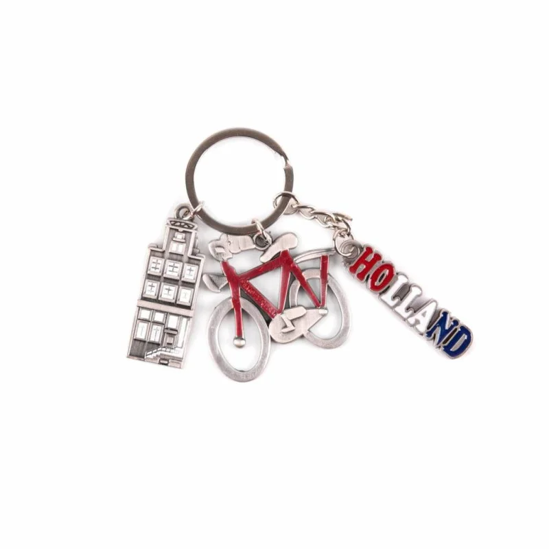 Deze leuke sleutelhanger is een perfect souvenir uit Holland! Hij is 9 cm lang (inclusief hanger) en toont een fiets, een grachtenpand en de tekst "Holland" als bedels. Deze symbolen staan allemaal bekend om hun connectie met Nederland en maken de sleutelhanger tot een uniek en herkenbaar aandenken aan je bezoek aan Nederland.