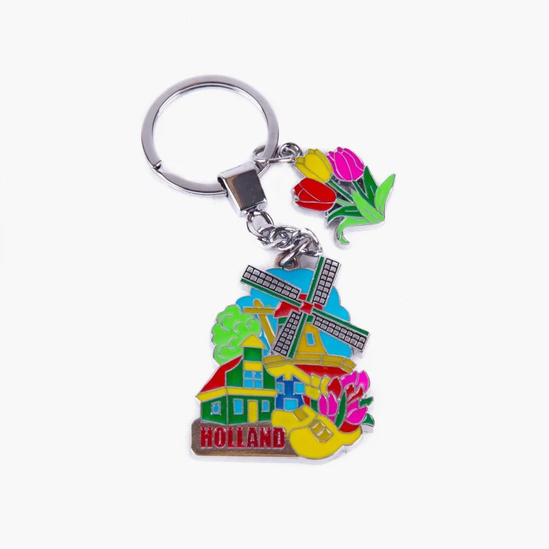 Deze kleurrijke sleutelhanger is een typisch Hollands souvenir. Het ontwerp bevat een molen, een klomp, tulpen en de tekst 'Holland'. De bijbehorende tulpbedel maakt het geheel compleet. Een perfect cadeau voor jezelf of iemand anders die van Nederland houdt!