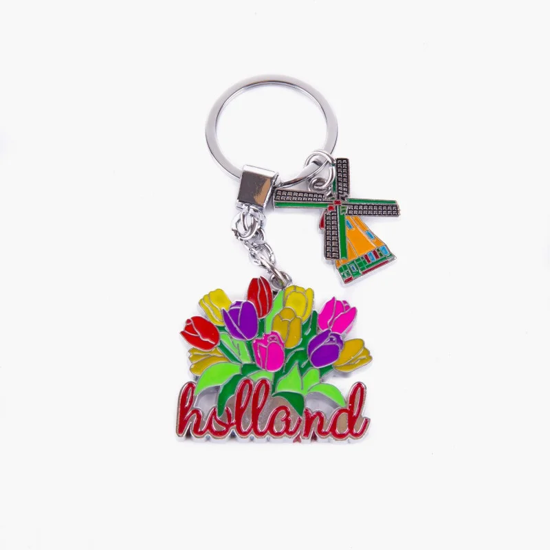 Deze vrolijke sleutelhanger is een perfect souvenir uit Holland! Hij toont een kleurrijk tulpenbos met een schattige bedel met de tekst "Holland". Een leuk aandenken aan je bezoek aan Nederland of een origineel cadeautje voor iemand die van Holland houdt.