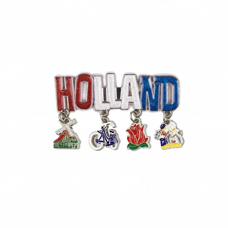 Deze kleurrijke magneet is een leuk en typisch Hollands souvenir. De magneet is 8,5 cm groot en toont de tekst "Holland" met daaraan vast vier bedels: een molen, een fiets, een tulp en een kussend paartje. Deze symbolen staan allemaal bekend om hun connectie met Nederland en maken de magneet tot een uniek en herkenbaar aandenken aan je bezoek aan Nederland.