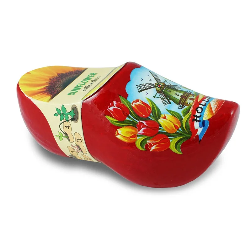 Het product is een klein, rood houten klompje van 10,5 cm waarin margrietzaadjes zijn verwerkt. Dit typische Nederlandse souvenir is niet alleen leuk om cadeau te geven, maar ook om zelf te gebruiken als mini-tuintje.