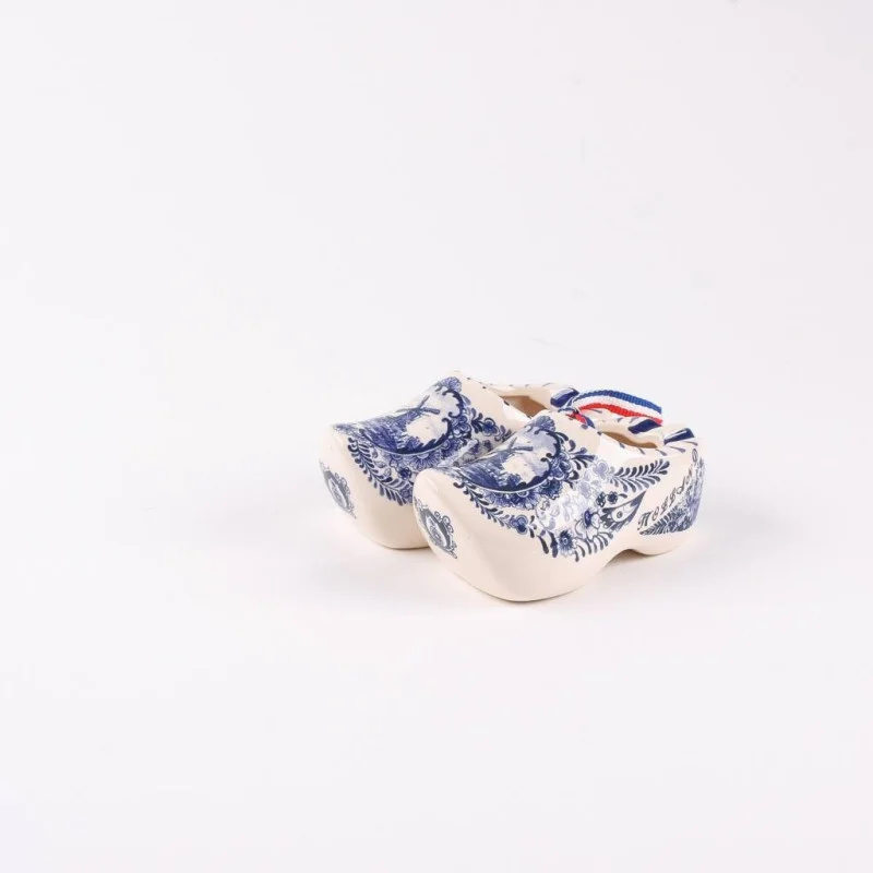 100 paar klompjes van 5 cm delfts blauw porselein, gebonden met rood wit blauw lintje