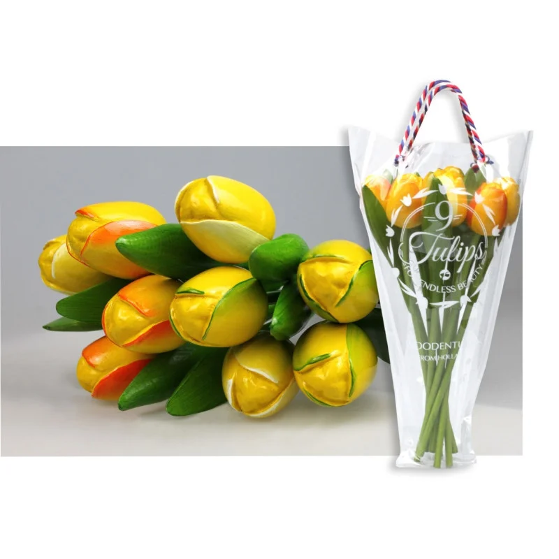 Dit opvallende boeket bestaat uit 9 grote, houten tulpen met een lengte van 34 cm. Elke tulp is zorgvuldig met de hand beschilderd in een levendige gele kleur, waardoor ze een vrolijke en energieke uitstraling hebben. De houten tulpen zijn niet alleen een lust voor het oog, maar ook duurzaam en gaan jarenlang mee. Het boeket wordt geleverd in een stijlvolle tulpentas, waardoor het een perfect cadeau is voor jezelf of voor iemand anders.