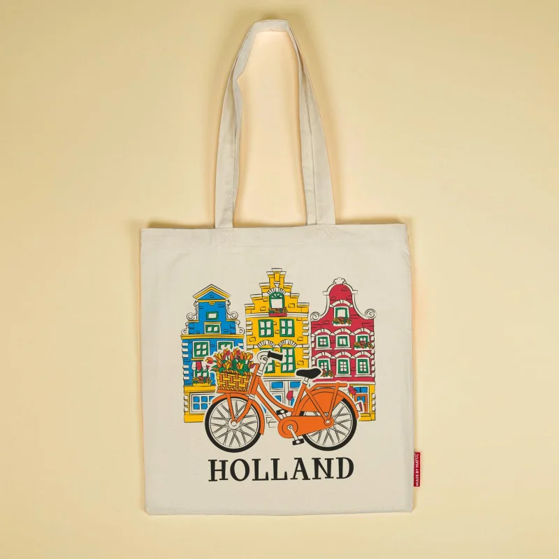 Deze vrolijke katoenen tas is perfect voor iedereen die van Holland houdt! De tas is bedrukt met een kleurrijke collage van typisch Hollandse huisjes, waardoor je altijd een stukje Nederland bij je draagt. De tas is gemaakt van stevig katoen en is ideaal voor boodschappen, een dagje uit of gewoon om je spullen in mee te nemen.