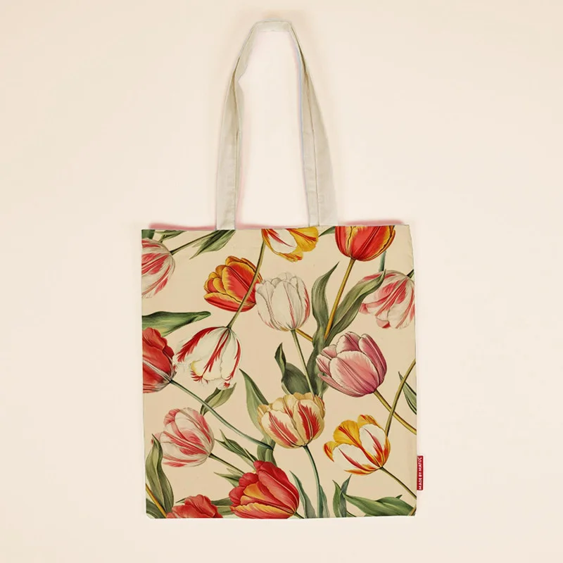 Breng een vleugje tijdloze elegantie in uw dagelijkse routine met deze prachtige katoenen totebag, versierd met een schitterend vintage bloemenpatroon. De tas toont een weelderige collectie tulpen in diverse tinten rood, roze en geel, prachtig afgebeeld alsof ze rechtstreeks uit een klassiek botanisch kunstwerk komen. Vervaardigd uit duurzaam katoen, is deze tas niet alleen een lust voor het oog, maar ook uiterst praktisch voor al uw benodigdheden – of het nu gaat om boodschappen, boeken, of als stijlvolle accessoire voor een dagje uit. De stevige handvatten zorgen voor comfortabel dragen, terwijl het ruime interieur voldoende plaats biedt. Een subtiele, rode merklabel aan de zijkant voegt een discrete touch toe. Deze tas combineert functionaliteit met een artistieke flair en is een must-have voor liefhebbers van vintage en bloemdessins.