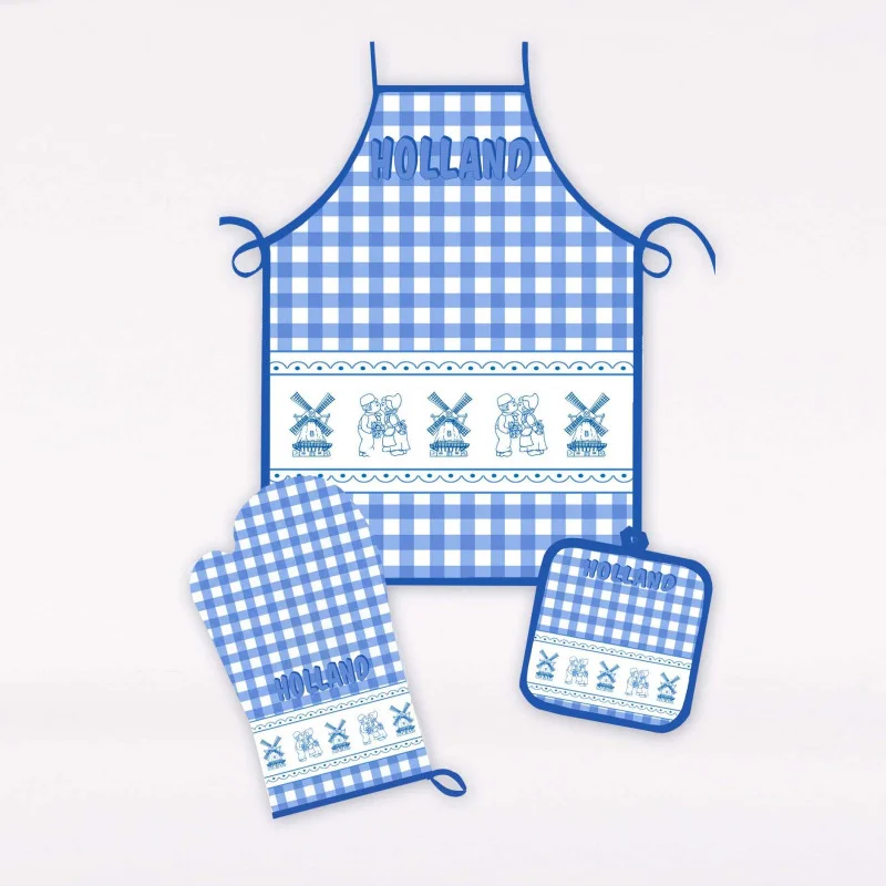 Deze driedelige Delftsblauwe keukenset bestaat uit een schort, ovenwant en pannenlap (kitchen apron, oven mitt, pot holder). De print heeft een Hollands thema. Met afbeelding van het bekende Hollandse kussende paartje