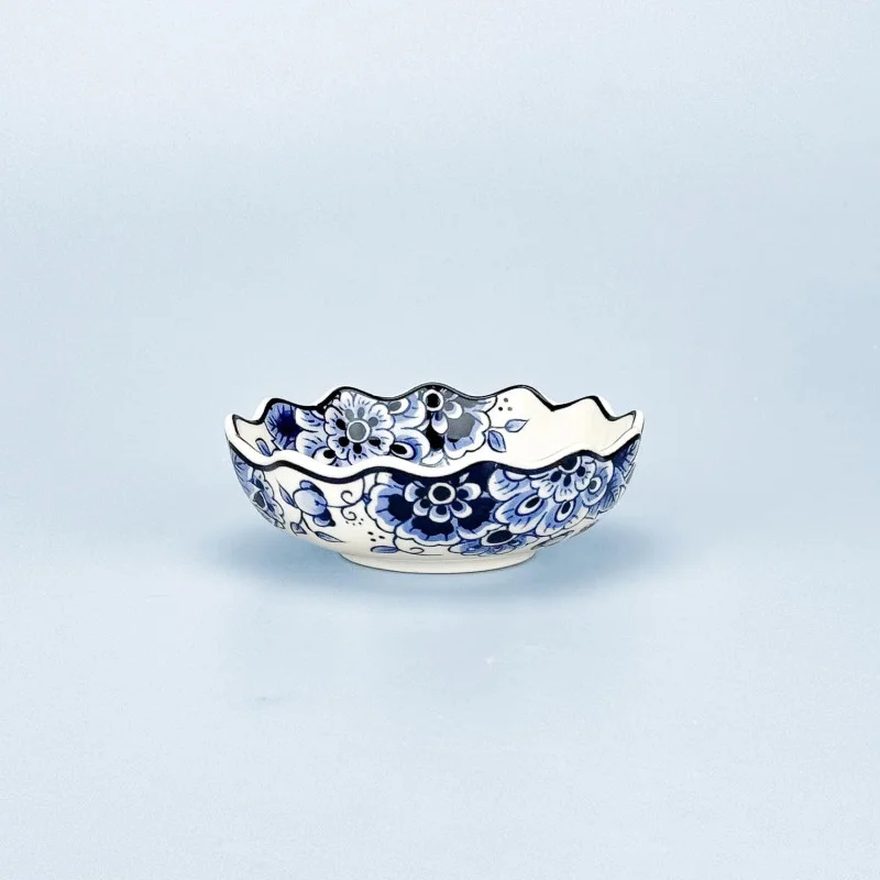 Geef uw tafelpresentatie een elegante, klassieke uitstraling met deze Delftsblauwe kom met golvende rand. Dit verfijnde schaaltje van hoogwaardig keramiek is versierd met een traditioneel bloemenmotief. De unieke, gewelfde rand geeft het item een speels en luxueus karakter, waardoor het perfect is voor het serveren van kleine hapjes, petitfours of als decoratief accent in uw interieur.