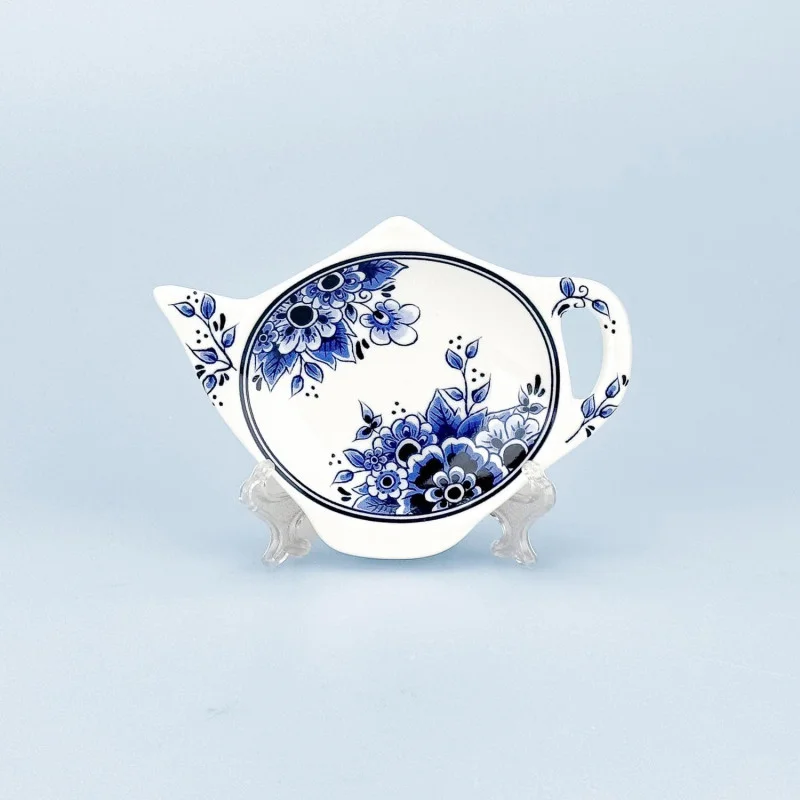 Voorkom kringen op tafel en presenteer uw gebruikte theezakje in stijl met deze charmante Delftsblauwe theezakjeshouder. Deze houder is uitgevoerd in de herkenbare vorm van een klassieke theepot en vervaardigd van hoogwaardig keramiek. Met een afmeting van 123 x 90 x 20 mm en een verfijnd bloemendecor is dit een functionele én decoratieve toevoeging aan uw theemoment.