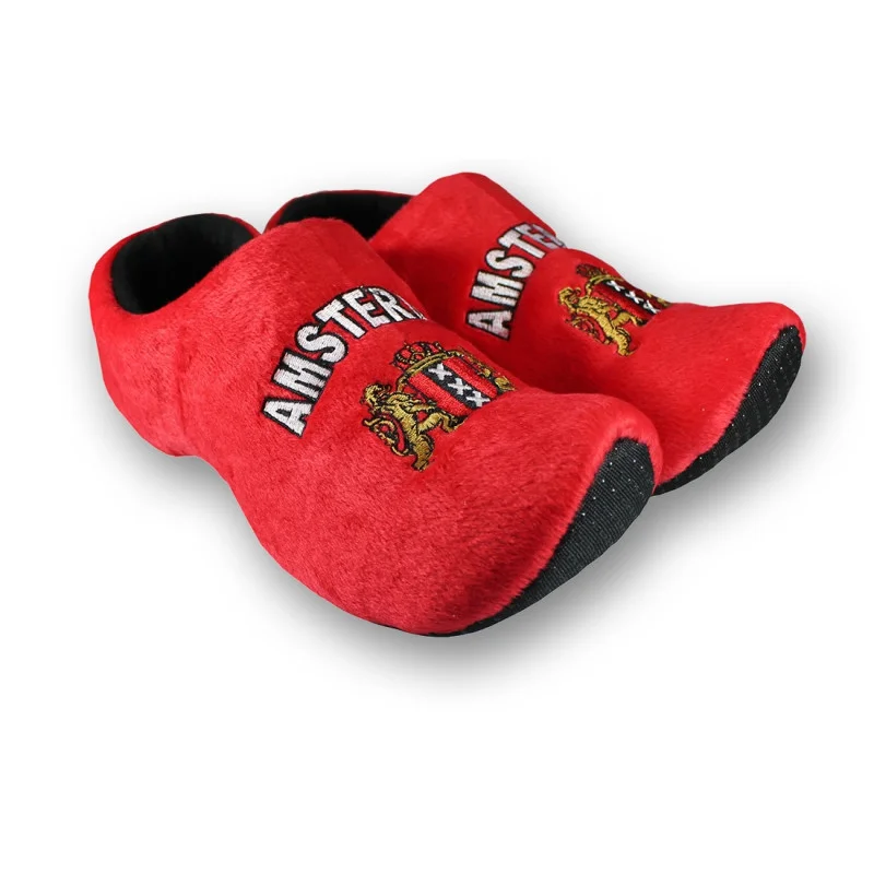 Warme, rode klomppantoffels met het iconische Amsterdamse wapen. Perfect voor koude dagen en als souvenir. Verkrijgbaar in diverse maten. (36-47)
