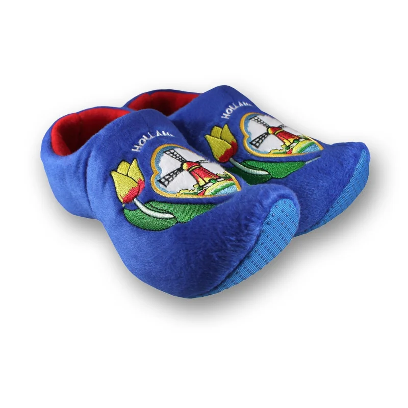 Warme, blauwe klomppantoffels met een typisch Nederlands design: een molen en tulpen. Perfect als cadeau! Verkrijgbaar in veel maten en geleverd in een feestelijke verpakking.