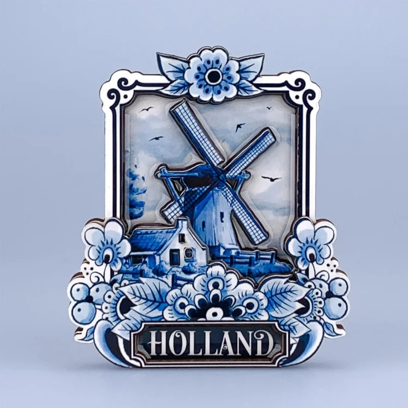 Op de voorgrond prijkt de tekst "HOLLAND" in een decoratief schild. Vervaardigd uit stevig MDF-materiaal, is deze magneet lichtgewicht, duurzaam en een perfect aandenken aan Nederland. Hang hem op je koelkast, whiteboard of een andere metalen ondergrond om een stukje Hollandse gezelligheid toe te voegen. Het is een ideaal souvenir of een klein, maar attent cadeau voor liefhebbers van Delfts Blauw en Nederlandse cultuur.