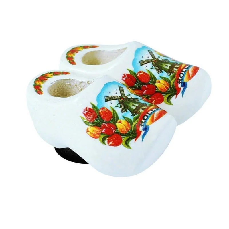 Deze magneetklompjes zijn een typisch Hollands souvenir, perfect om je koelkast of andere metalen oppervlakken op te vrolijken. De klompjes zijn wit geschilderd en hebben een kleurrijk tulpenmotief, een symbool van Nederland. Met een afmeting van 4 centimeter zijn ze compact en passen ze overal. Aan de achterkant zit een sterke magneet, zodat je ze gemakkelijk kunt bevestigen.