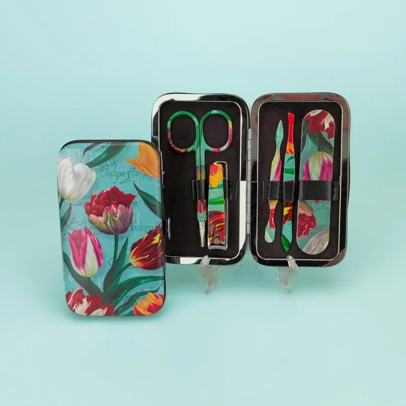 Dit vrolijke manicuresetje is de perfecte aanvulling voor elke handtas. Het heeft een fris, groen ontwerp met kleurrijke tulpen en bevat alle essentiële gereedschappen voor een verzorgde manicure, zoals een nagelknipper, vijl, pincet en nagelschaartje. Het compacte etui maakt het ideaal om mee te nemen op reis.
