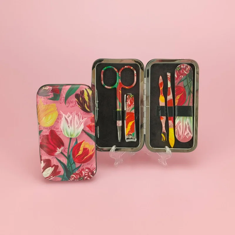 Dit schattige manicuresetje is een must-have voor elke nagelverzorgingsliefhebber. Het vrolijke ontwerp met roze tinten en kleurrijke tulpen maakt het een echte eyecatcher. Het setje is praktisch en bevat alle benodigde tools voor een perfecte manicure, zoals een nagelknipper, vijl, pincet en nagelschaartje. Het is verpakt in een handig etui, perfect om mee te nemen op reis.