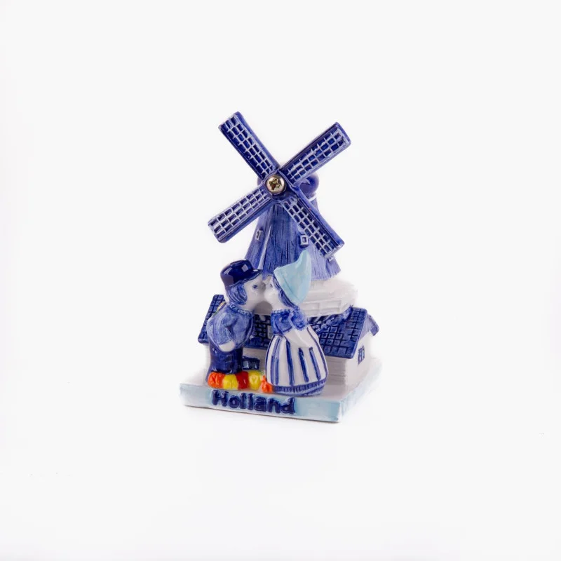 Delfts blauwe molen met een kussend paartje is een decoratief item gemaakt van keramiek. Het combineert de iconische Nederlandse windmolen met een traditioneel kussend paartje, vaak gekleed in traditionele Nederlandse kleding en klompen.