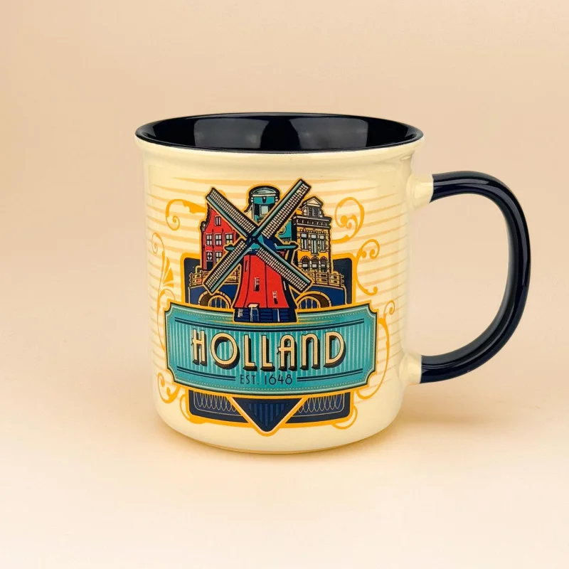 Deze beker van keramiek en porselein heeft een vintage uitstraling met een gedetailleerde afbeelding van de Hollandse skyline. De print is voorzien van grachtenpanden, een klassieke windmolen en de tekst "HOLLAND EST. 1648". De beker is wit met blauwe strepen en heeft een opvallend donkerblauw handvat en een donkerblauwe rand aan de bovenzijde. Met een afmeting van 100 x 95 mm is deze mok perfect voor dagelijks gebruik en een uniek verzamelstuk. (Inhoud +/- 300 ml)