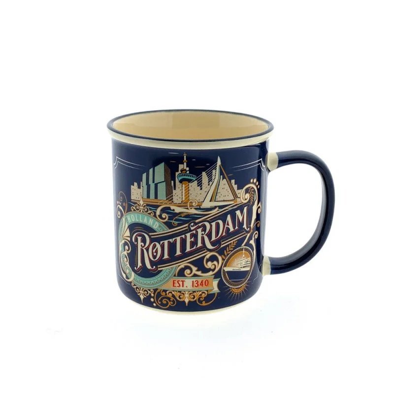 Deze vintage mok is een must-have voor elke Rotterdammer of liefhebber van de stad! Met een uniek ontwerp van Rotterdamse ornamenten tegen een achtergrond van de skyline, is deze mok een perfect cadeau of souvenir. Geniet van je favoriete drankje met deze stijlvolle en nostalgische mok, die de rijke geschiedenis en cultuur van Rotterdam weergeeft. De mok wordt geleverd in een mooie geschenkverpakking, waardoor het een ideaal cadeau is voor verjaardagen, feestdagen of gewoon om iemand te verrassen. (Inhoud 325 ml) 10 cm hoog en 9 cm doorsnede