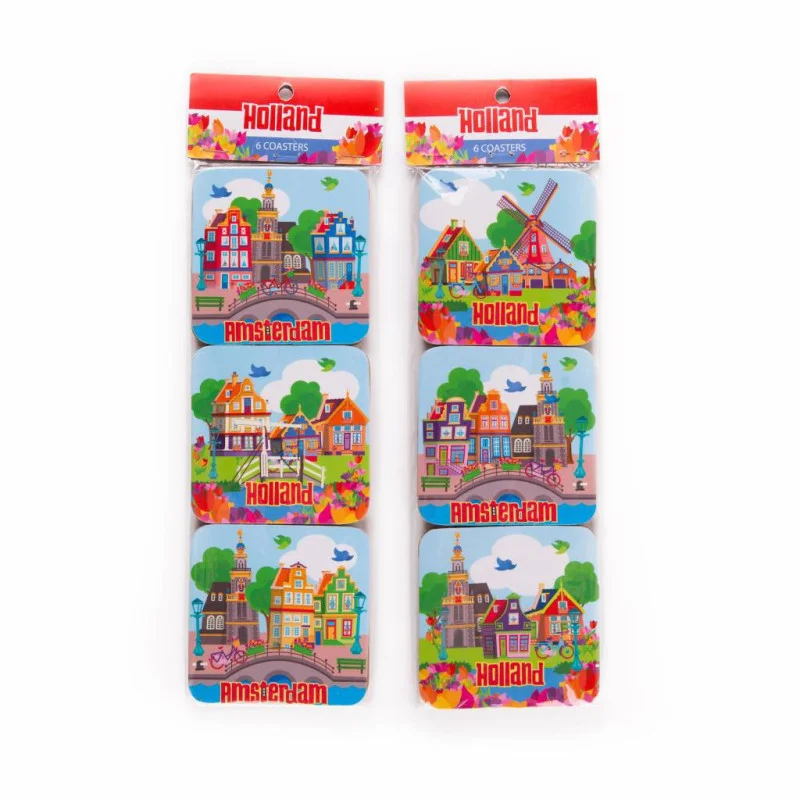 6 verschillende onderzetters met Amsterdam & Holland village. Ze zijn gemaakt van kurk. Een echt Hollands cadeautje of souvenir!