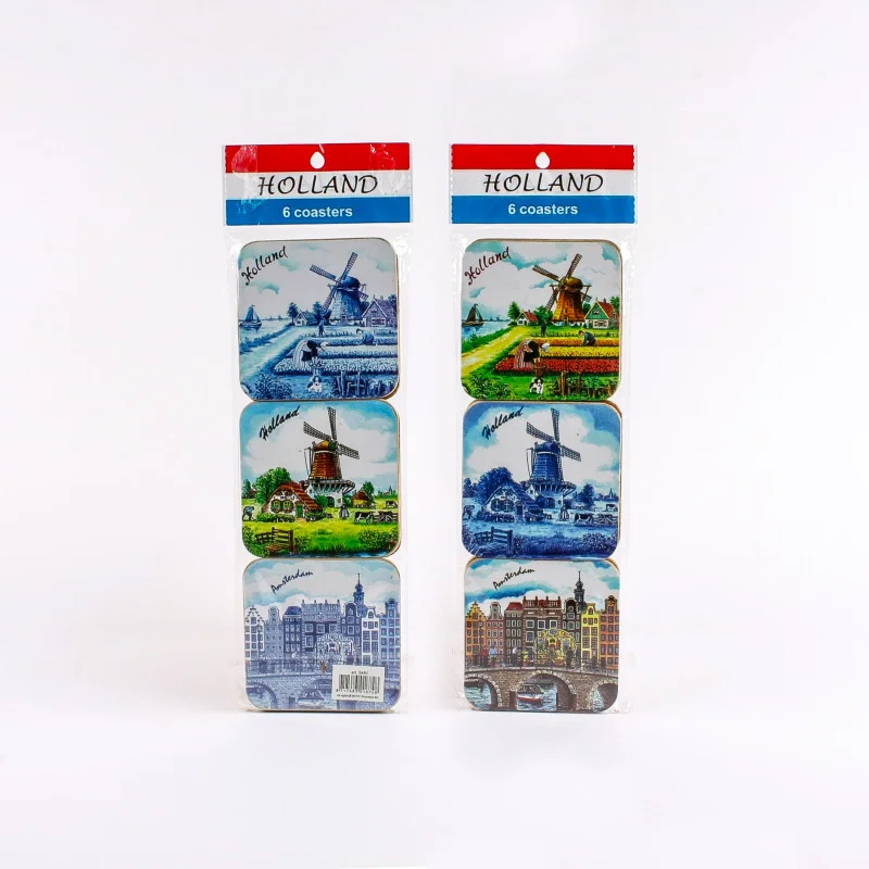 6 verschillende onderzetters met molens en grachten in delftsblauw en multicolor. Ze zijn gemaakt van kurk.