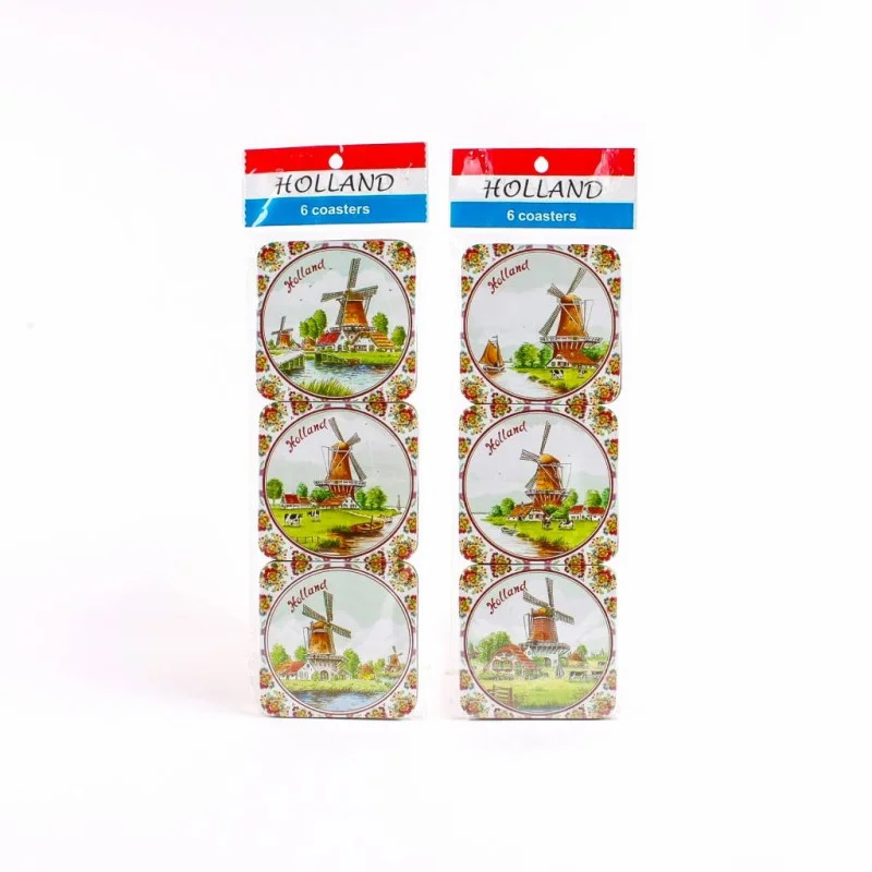 6 verschillende onderzetters met molens multi colour ze zijn gemaakt van kurk en hebben een prachtige opdruk van een mooie Hollandse molen met waterlandschap. Een origineel souvenir!