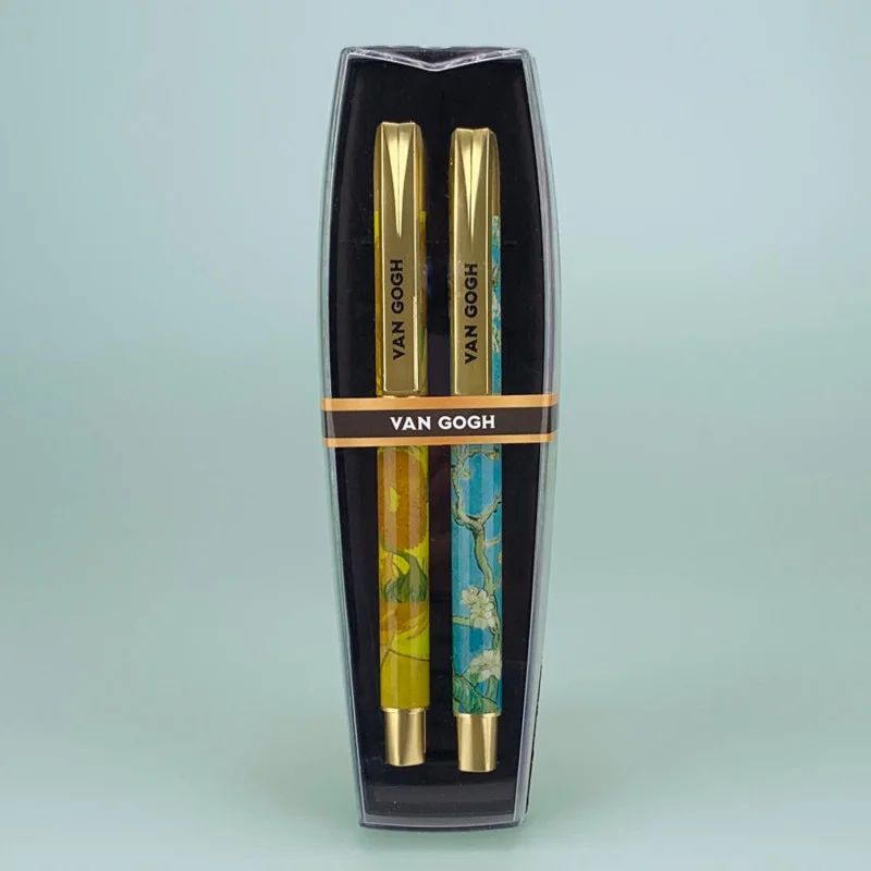 Deze elegante pennen set is een eerbetoon aan de wereldberoemde Nederlandse schilder Vincent van Gogh. De set bestaat uit twee pennen en is een perfect souvenir of cadeau voor kunstliefhebbers. Het schrijfgerei is versierd met gedetailleerde weergaven van twee van zijn meesterwerken. Eén pen toont een deel van 'Zonnebloemen' met zijn kenmerkende gele en bruine tinten, terwijl de andere een fragment van 'Amandelbloesem' laat zien met de delicate blauwe en witte bloesems op een tak. De goudkleurige details en de opdruk "VAN GOGH" geven de set een luxe uitstraling. Deze set wordt geleverd in een transparante geschenkdoos, wat het een perfect presentje maakt. Gemaakt van diverse materialen, combineert deze set functionaliteit met een herkenbaar kunstzinnig design.