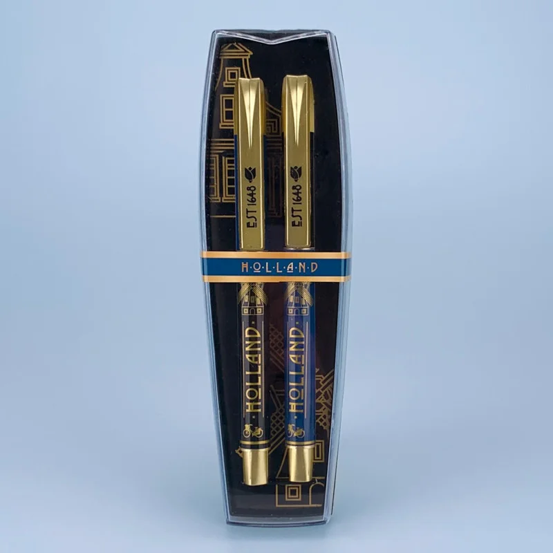 Elke pen heeft een slanke, goudkleurige bovenzijde met de gravure "EST 1648", wat een knipoog geeft naar een historisch jaartal. De behuizing van de pennen is uitgevoerd in diepblauw, versierd met gouden opdrukken van traditionele Nederlandse gevels of grachtenhuizen, typisch voor de Amsterdamse architectuurstijl die verwant is aan Art Deco. Het woord 'HOLLAND' is prominent in sierlijke letters afgebeeld.