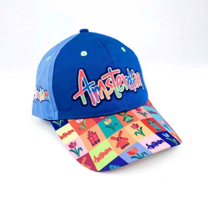 Blauwe Amsterdam Pet met Kleurrijke Klep | Trendy Hoofddeksel