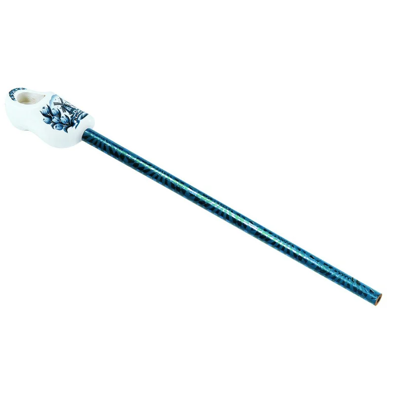 Een leuk potlood waarbij het uiteinde is vormgegeven als een miniatuur Delfts blauw klompje. Op dit klompje zijn traditionele Hollandse symbolen afgebeeld: een windmolen en tulpen. Het is een leuk en functioneel aandenken aan Nederland.