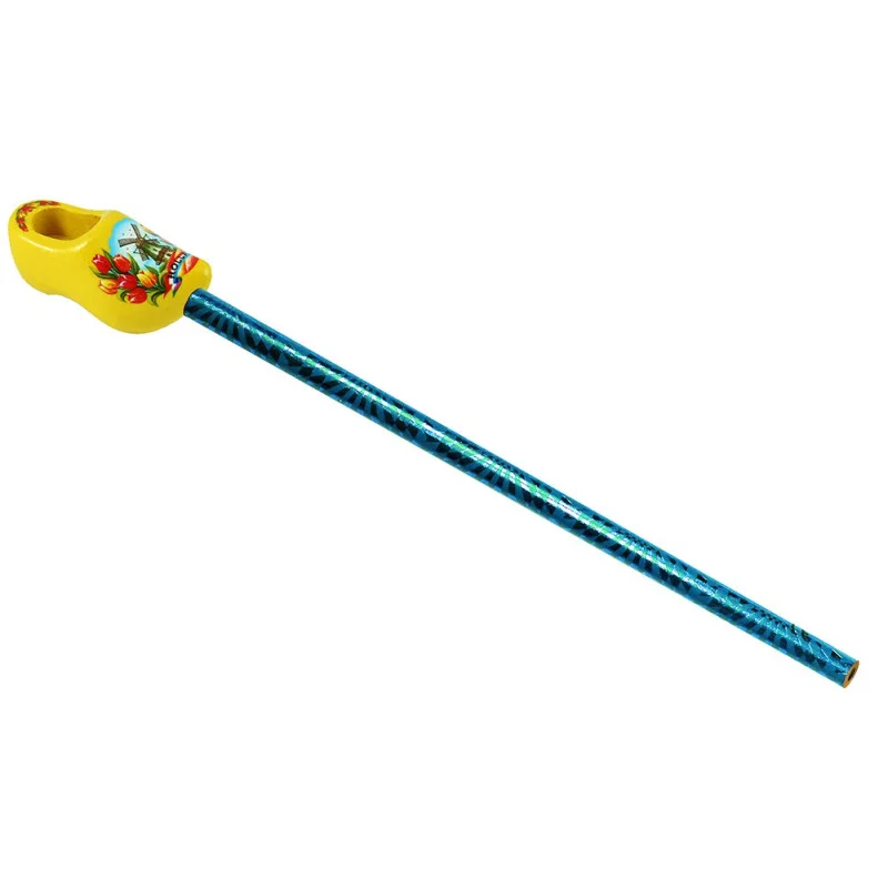 Dit is een vrolijk en herkenbaar Nederlands souvenir: een potlood met een miniatuur houten klompje. Het klompje is geel geverfd en gedecoreerd met een afbeelding van een traditionele windmolen en kleurrijke tulpen. De gele kleur van het klompje springt eruit en past goed bij de andere Hollandse symbolen. Het is een leuk aandenken aan een bezoek aan Nederland of een klein cadeautje om iemand mee te verrassen. Het potlood zelf is meestal van hout en kan verschillende kleuren hebben, vaak in contrast met het gele klompje, zoals blauw, groen of een natuurlijke houtkleur. Het klompje is stevig aan het potlood bevestigd.