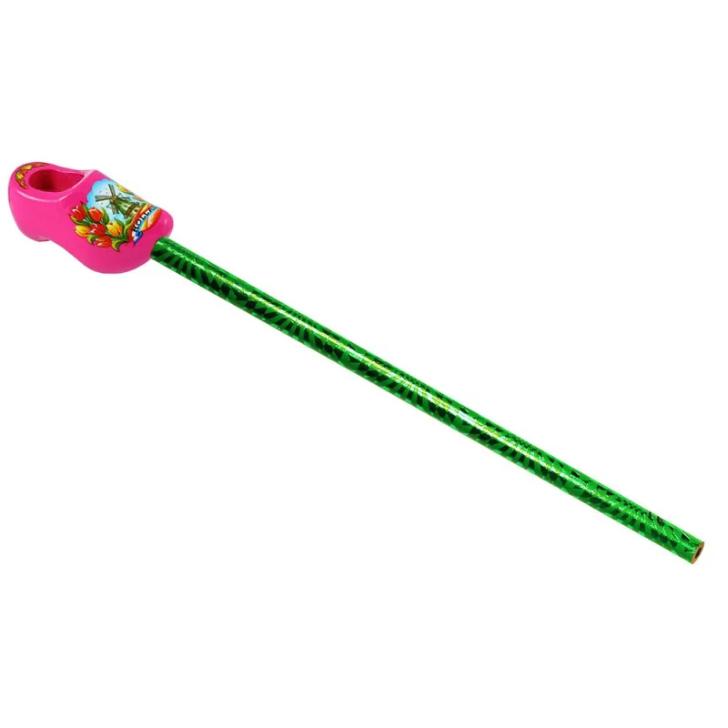 Dit is een vrolijk en typisch Nederlands souvenir: een potlood met een miniatuur houten klompje. Het klompje is roze geschilderd en gedecoreerd met een afbeelding van een traditionele windmolen en kleurrijke tulpen. De combinatie van de roze kleur met de Hollandse symbolen maakt dit potlood extra aantrekkelijk en speels. Het is een leuk aandenken aan een bezoek aan Nederland of een klein cadeautje. Het potlood zelf is meestal van hout en kan diverse kleuren hebben, maar vaak wordt een groene kleur gebruikt die mooi contrasteert met het roze klompje. Het klompje is stevig aan het potlood bevestigd.