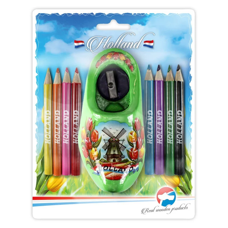 Deze leuke blisterverpakking bevat een groene puntenslijper in de vorm van een klomp, versierd met een afbeelding van een molen en tulpen. Daarnaast zijn er ook nog eens meerdere kleurpotloden inbegrepen. Perfect als souvenir, klein cadeautje of gewoon voor jezelf.