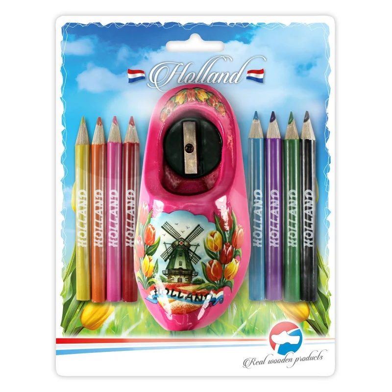 Deze leuke blisterverpakking bevat een roze puntenslijper in de vorm van een klomp, versierd met een afbeelding van een molen en tulpen. Daarnaast zijn er ook nog eens meerdere kleurpotloden inbegrepen. Perfect als souvenir, klein cadeautje of gewoon voor jezelf.