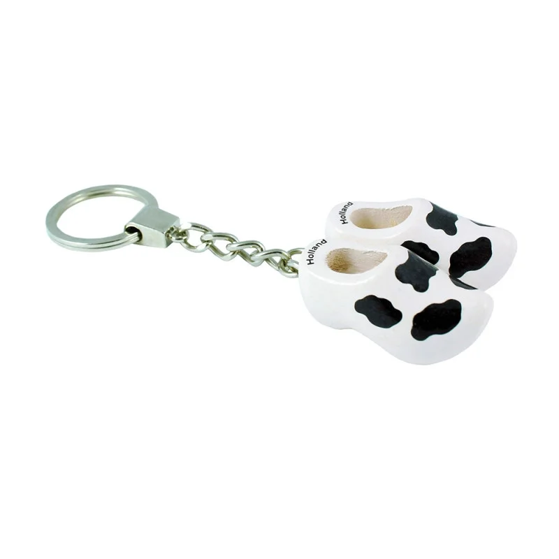 Deze unieke sleutelhanger is geïnspireerd op de Nederlandse koe en bestaat uit twee kleine, witte klompjes van elk 4 centimeter. De klompjes zijn versierd met karakteristieke zwarte vlekken, waardoor ze lijken op kleine koeienvoetjes. Het is een leuk en origineel cadeau-idee voor jezelf of voor iemand anders die van dieren en Nederland houdt. De sleutelhanger is compact en gemakkelijk mee te nemen, waardoor je hem overal aan je sleutels kunt bevestigen.