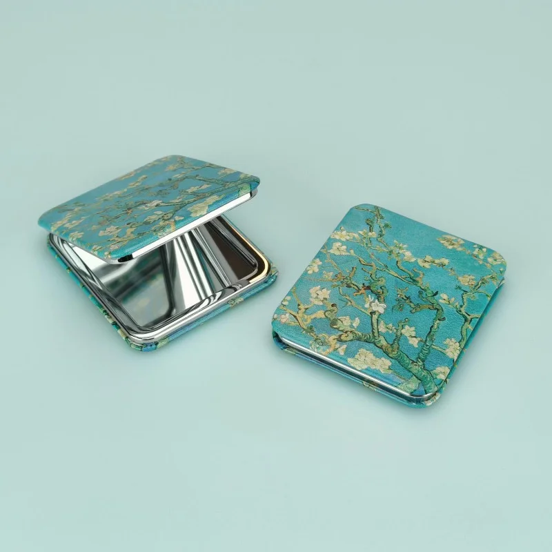 Dit prachtige, compacte spiegeldoosje is een must-have voor elke kunstliefhebber. Het is versierd met een levendige reproductie van Vincent van Goghs beroemde amandelbloesem schilderij. Perfect voor onderweg om je make-up bij te werken of gewoon als decoratief item.