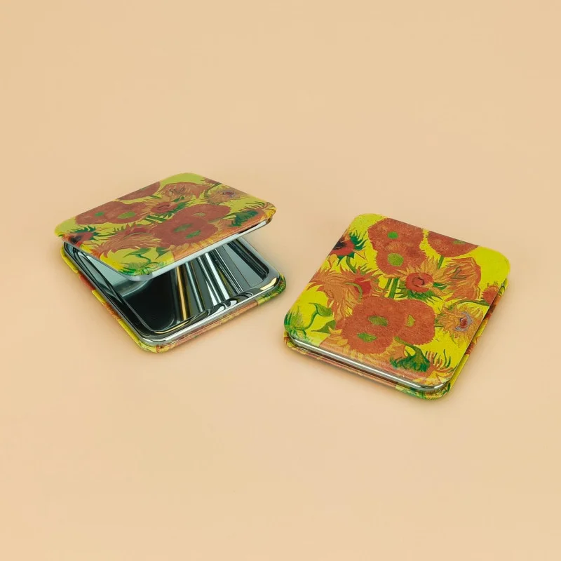 Dit compacte en stijlvolle spiegeldoosje is een must-have voor elke kunstliefhebber. Het is versierd met een levendige reproductie van Vincent van Goghs beroemde zonnebloemen schilderij. Perfect voor onderweg om je make-up bij te werken of gewoon als decoratief item.